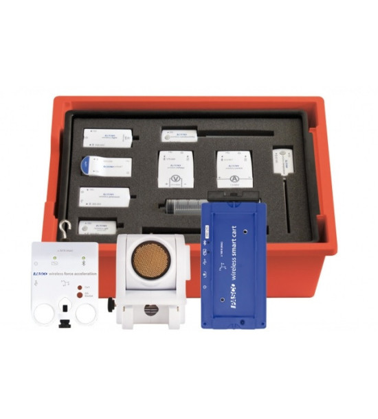 Sensorium Fyzika 4.1 - sada bezdrôtových senzorov PASCO v červenom boxe, prispôsobená pre hodiny Fyziky. Sada obsahuje: bezdrôtový senzor teploty, bezdrôtový senzor tlaku, bezdrôtový senzor napätia, bezdrôtový senzor prúdu, bezdrôtový svetelný senzor, bezdrôtový senzor pohybu, bezdrôtový senzor magnetického poľa a bezdrôtový vozík Smart Cart s držiakom na stojan, USB s 46 žiackymi úlohami, tlačenú metodiku a licenciu softvéru SPARKvue.