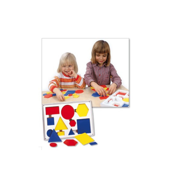 Univerzálna pomôcka obsahuje päť základných geometrických tvarov (kruh, štvorec, obdĺžnik, trojuholník a šesťuholník) v kombináciách dvoch rozmerov, troch farieb (žltá, modrá a červená) a dvoch hrúbok. Vhodná pre predškolský vek (spoznávanie tvarov, tried...).