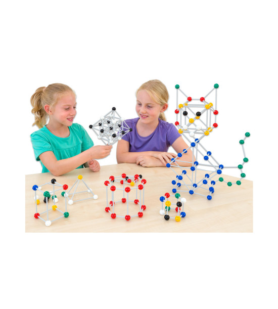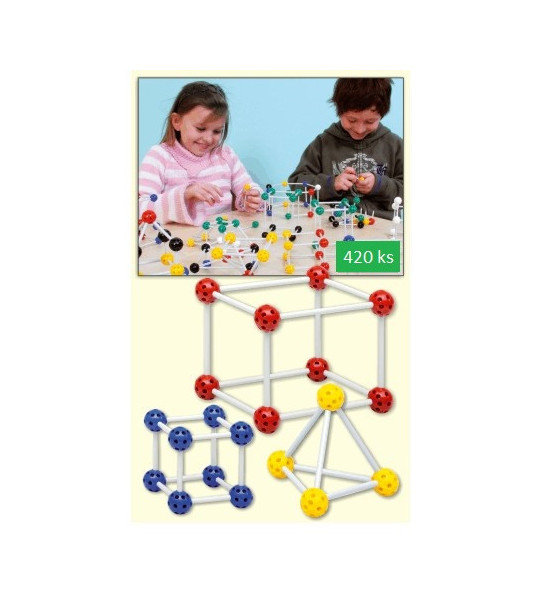 Sada 420ks základných stavebných prvkov (hrany a uzly) pre tvorbu rovinných a priestorových útvarov. Objavujte kocky, pyramídy, hranoly, ihlany a i. Vysvetlite pojmy ako strana, plocha, povrch a to všeko vďaka guľôčkam a paličkám, ktoré môžete jednoducho spájať. Každá guľôčka má 26 otvorov. Paličky majú rôzne dĺžky. Vyrobené z trvanlivého plastu. 180 guľôčok a 240 paličiek.