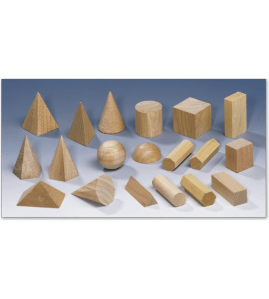 Drevené priestorové telesá s výškou do 7,5cm a priemerom do 5cm tvoria: kužele, guľa, pologuľa, kocka, valce, rôzne ihlany, rozličné hranoly a pravouhlé útvary. Vhodné pre skúmanie pomeru medzi plochou, objemom a tvarom telies.Obsah: 12ks geometrických telies.
