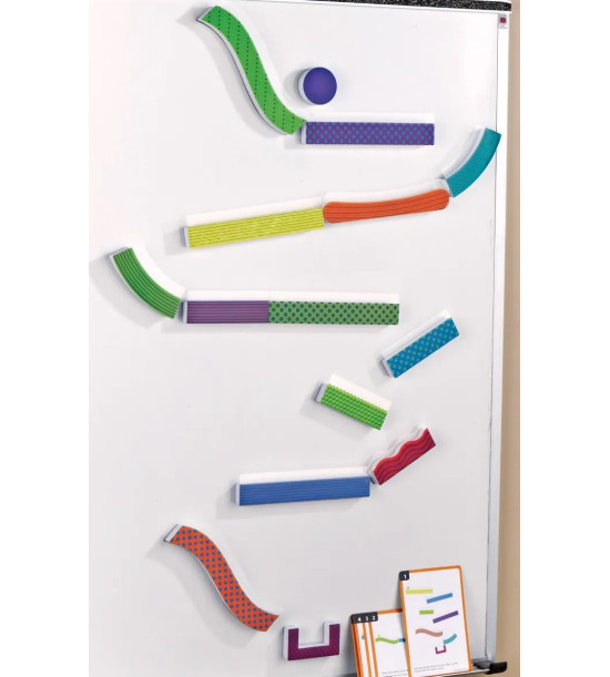 Guľôčková STEM pádová dráha na magnetickú tabuľu. Usporiadajte magnetické dieliky, na najvrchnejší dielik položte a pustite guľôčku a zistite, či vaša dráha funguje a či guľôčka doputuje až do cieľa. Sada obsahuje: - 14 magnetických penových dielcov a 1 magnetický penový cieľ - 4 hracie guľôčky - 10 obojstranných kartičiek s aktivitami. Najdlhší diel má 25cm. Pre deti od 5 rokov.