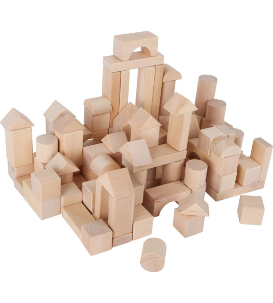 Stavebnica klasického dizajnu z robustných drevených kociek. Keď deti skončia s hraním, môžu si kocky uložiť do praktického plátenného vrecka. Vyrobené z kvalitných materiálov zo zodpovedných zdrojov. Vyrobené v Nemecku z kvalitných a zodpovedne získaných materiálov. Obsahuje 100 kusov drevených kociek (najväčšia kocka 9 x 3 x 1,5cm) a plátenné vrecko na uloženie kociek.