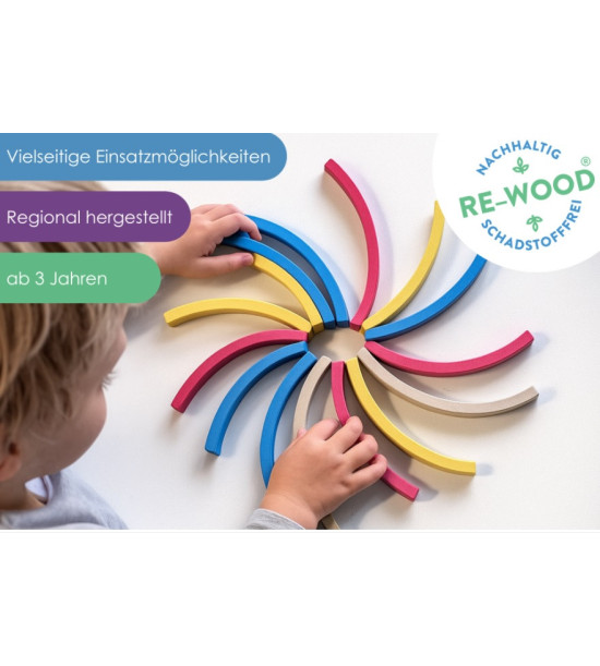 Oblúkové stavebné bloky RE-Wood sú všestranné stavebné prvky pre neobmedzené kreatívne dizajny. Či už mandaly, vzory, figúrky alebo trojrozmerné štruktúry – nové tvary a nápady vznikajú znova a znova len z niekoľkých kusov. Farebné oblúky sa dajú úžasne kombinovať a rozširovať o bežné predmety alebo prírodné materiály.Podporujú tak predstavivosť a jemnú motoriku a nabádajú k tvorivej hre. Materiál, ktorý vydrží.Balené v krabici s návodom a príkladmi rozloženia.
