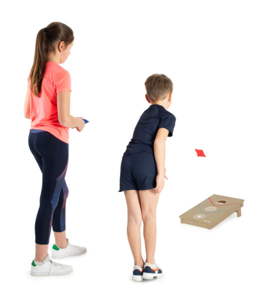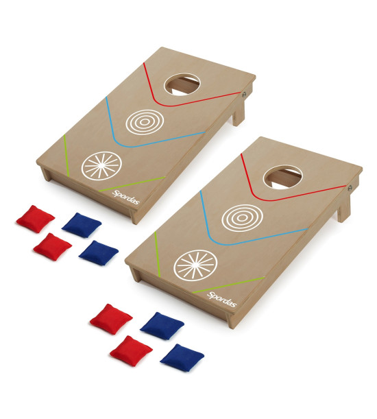 Cornhole je oddychová hádzacia hra, v ktorej môžu hrať 2-4 hráči súčasne. Každý hráč (alebo tím) má 4 vrecúška naplnené fazuľkami, ktoré hádže a snaží sa trafiť do otvoru (priemer: 9 cm) hernej platformy. Za zásah do otvoru sa počítajú 3 body, za zásah do plošiny sa počíta 1 bod. Špecifický dizajn hernej dosky ponúka ďalšie zóny a preto je možné pridať zložitejšie pravidlá pre viac zábavy a vzrušenia. Kompaktné, prenosné plošiny sú vybavené pevnými, skladacími drevenými nohami.Sada obsahuje 2 prenosné herné dosky (52 x 30 x 14,5 cm) a 8 x 6,5 cm hádzacie vrecká (4 červené a 4 modré). Plošiny sú vyrobené z FSC certifikovaného MDF dreva.