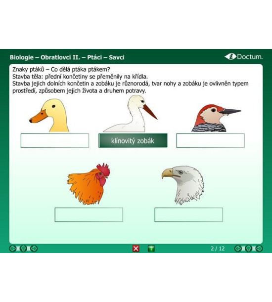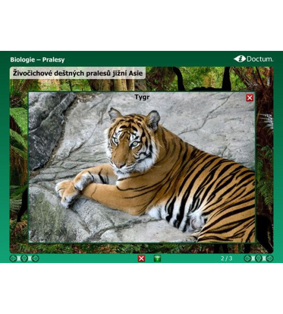 iDoctum - Interaktivní vyučovací software Biologie - Svět zvířat. Verze v českém jazyce. Pomocí tohoto výukového interaktivního programu se mohou žáci seznámit se světem zvířat. První část programu umožňuje pochopit rozdělení zvířat od nejjednodušších až po ty nejsložitější formy, od jednobuněčných k obratlovcům. Druhá část popisuje místa výskytu zvířat pomocí obrázků, 3D animací, kreseb a ukazuje obrovskou rozmanitost zvířat od rovníku k pólům. Témata: Jednobuněční Mořské houby, žahavci Červi Měkkýši Členovci Obratlovci Pralesy Savany Pouště Stepi Tajga, tundra, ledový pás Mořský svět