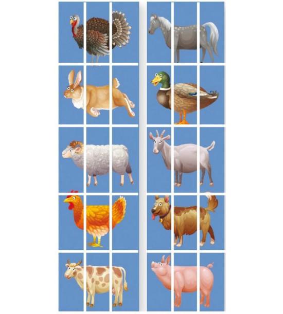 Kobercová skladačka - zvieratká z farmy. Materiál: polyester. Spodná vrstva je protišmyková. Sada obsahuje 10 zvieratiek v 3 častiach. Úlohou detí je správne zostaviť jednotlivé zvieratká, alebo robiť kombinácie a vytvárať tak zábavné nové druhy zvierat. Rozmer 1 časti: 43,5 x 29 cm.