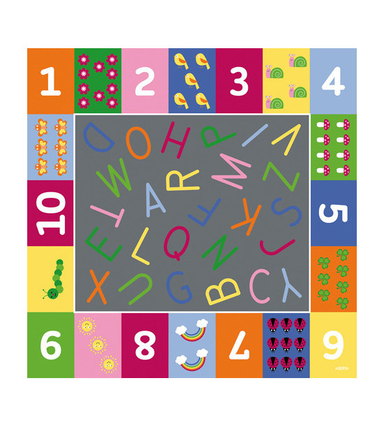 Vinylová podložka - Čísla a písmenká, 200 x 200 cm. Podložka na hry vyrobená z odolného vinylu, bez ftalátov. Je odolná voči UV žiareniu, a preto je vhodná na použitie aj v exteriéri. Rozmery: 200 x 200 cm.