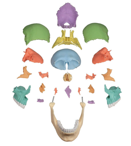 MODEL DIDAKTICKÁ ĽUDSKÁ LEBKA, 22 ČASTÍ. Kosti lebky s realistickými kostnými švami sú vo svojej polohe sú držané silnými magnetmi. Model priemernej európskej lebky dospelých možno rozobrať na 22 jednotlivých kostí. Ľahká manipulácia vďaka pevným častiam s magnetickými spojmi, kosti s realistickými kostnými švami sa len vložia do svojej polohy a sú držané silnými magnetmi. Tento model je ideálnym tréningovým prostriedkom pre osteopatiu, na vizuálne rozlíšenie jednotlivých kostí v rôznych farbách, na ktoré lebku je možno rozložiť: tylová kosť, klinová kosť, čelová kosť, spánková kosť (pravá aj ľavá), temenná kosť (pravá aj ľavá), slzná kosť, nosová kosť, čerieslo, lícna kosť, horná čeľusť so zubami (ľavá aj pravá), dolná čeľusť so zubami, poschodová kosť (ľavá aj pravá), čuchová kosť (ľavá aj pravá), dolnej nosovej klenbu (ľavá aj pravá). Rozmery: 22x16x23 cm, hmotnosť: 0,8kg. Vďaka aplikácii Augmented Anatomy (verzia EN, DE) v kombinácii s týmto kvalitným anatomickým modelom je učenie jednoduchšie a efektívnejšie. Táto aplikácia automaticky rozpoznáva anatomické modely EZ a zobrazuje nomenklatúru v rozšírenej realite. Aplikácia rozšírenej anatómie funguje na všetkých bežných smartfónoch alebo tabletoch.