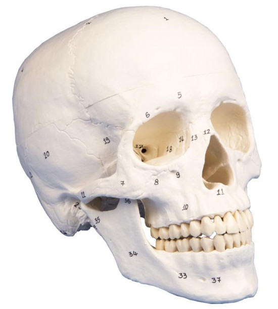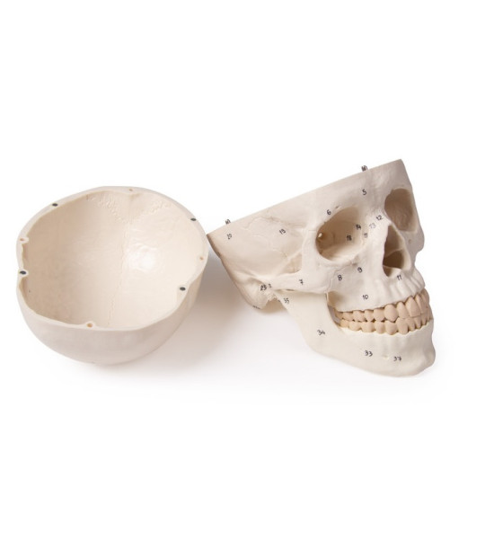Model lebky s označeniami kostí a štruktúr, 3-dielny. Model lebky má všetky anatomické detaily a štruktúry. Trojdielny model sa skladá z lebky, lebečnej klenby a dolnej čeľuste. Zuby zodpovedajú skutočnému chrupu, čo sa týka polohy a ostria. Dolná čeľusť je pohyblivá a demontovateľná. Klenba lebky sa pomocou kovových čapov pripevňuje na základňu lebky a držia ju silné magnety. Z tohto dôvodu nie sú potrebné rušivé háky. Model zodpovedá priemernému dospelému Európanovi. Veľkosť: 18 x 19 x 12 cm, hmotnosť: 0,7 kg