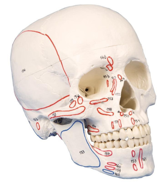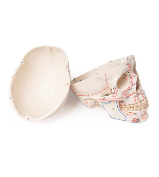 Model lebky s označením svalových úponov, 3-dielny. Model lebky má všetky anatomické detaily a štruktúry, skladá sa z lebky, lebečnej klenby a dolnej čeľuste. Zuby zodpovedajú skutočnému chrupu, čo sa týka polohy a ostria. Dolná čeľusť je pohyblivá a demontovateľná. Klenba lebky sa pomocou kovových čapov pripevňuje na základňu lebky a držia ju silné magnety. Z tohto dôvodu nie sú potrebné rušivé háky. Model zodpovedá priemernému dospelému Európanovi. Veľkosť: 18 x 19 x 12 cm, hmotnosť: 0,7 kg
