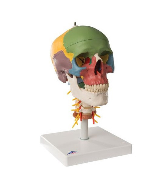 Model využíva 19 rôznych farieb, aby zobrazil tvary a rozdelenie jednotlivých častí lebky. Pružne namontovaný na krčnú chrbticu. Zobrazuje zadný mozog, miechu, miechové nervy krčnej chrbtice a vertebrálnych tepien, bazilárnej tepny a zadné mozgové tepny. Plastová lebka, odnímateľná zo stojana. Rozmery: 20x13,5x15 cm. Hmotnosť: 1,4 kg.