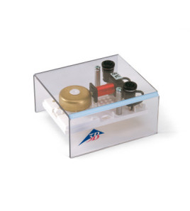 Kovový stojan s gumeným tesnením s priemerom 250 mm, výškou 90 mm, dvoma vyvedenými bezpečnostnými zdierkami a káblami (čierny a červený) v dĺžke 1 m, napätie max. 48V, prúd max. 12A. Hadicové napojenie (8 mm/12mm) na trysku s kohútikom a ventil na vyrovnanie tlaku. K vytvoreniu sady na Vákuum je potrebné doobjednať ešte sklenený zvon kód 12000023C.
