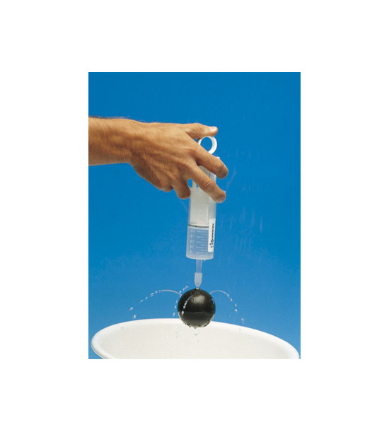 Pomôcka na demonštráciu rovnomerného pôsobenia tlaku v kvapalinách. Plastová pumpa (striekačka) s piestom je zakončená plastovou guľou s otvorom na všetkých stranách. Celková dĺžka cca 160mm. Objem striekačky je 100ml, priemer gule je 60mm.