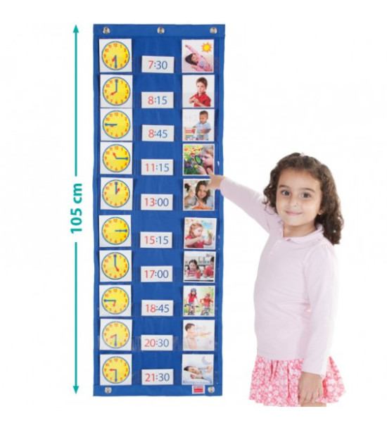 Cieľom hry je naučiť sa postupne vykonávať aktivity, ktoré sa odohrávajú počas celého dňa a určovať k tomu, koľko je hodín klasicky na ciferníku hodín, ako aj v digitálnej podobe. Dieťa sa učí na základe každodenných činností, ktoré sa odohrávajú v jeho okolí. Princípom je postupne pripínať na tabuľu obrázky znázorňujúce činnosti, ktoré má dieťa vykonať v rôznom čase. Sadu je možné použiť v dvoch formátoch: 12-hodinový (analógový) a 24-hodinový (digitálny). Tabuľa s priehľadnými vreckami 105x35 cm; 36 kariet znázorňujúcich aktivity 9x9 cm; 36 kariet s hodinami zobrazujúcimi čas 9x9 cm; 72 kariet znázorňujúcich čas v digitálnej podobe 9x4,5 cm; 12 kariet označujúcich, či sa jedná o predpoludnie (am) alebo popoludnie (pm) rozmer 9x9 cm. Od 3 rokov.