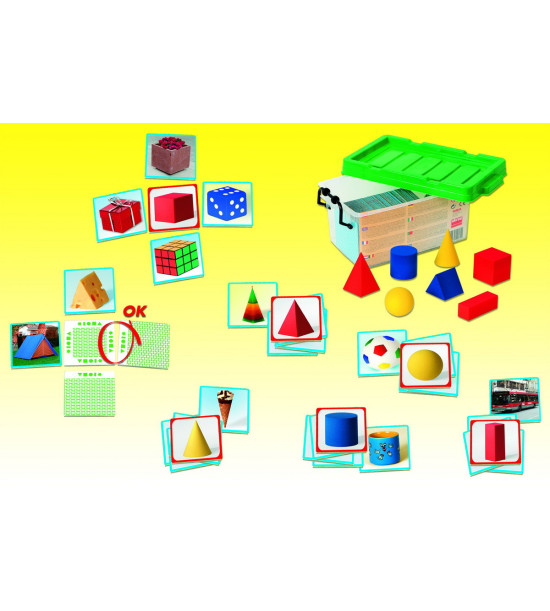 Pomôcka pozostáva zo 7 plných geometrických telies a 35 kartičiek s fotografiami. Kartičky možno rozdeliť na 7 základných, ktoré zobrazujú samotné geometrické telesá a 28 fotografií objektov, ktoré reprezentujú geometrické tvary v bežnom živote. Obsahuje samokontrolný opravný systém a pedagogický návod.