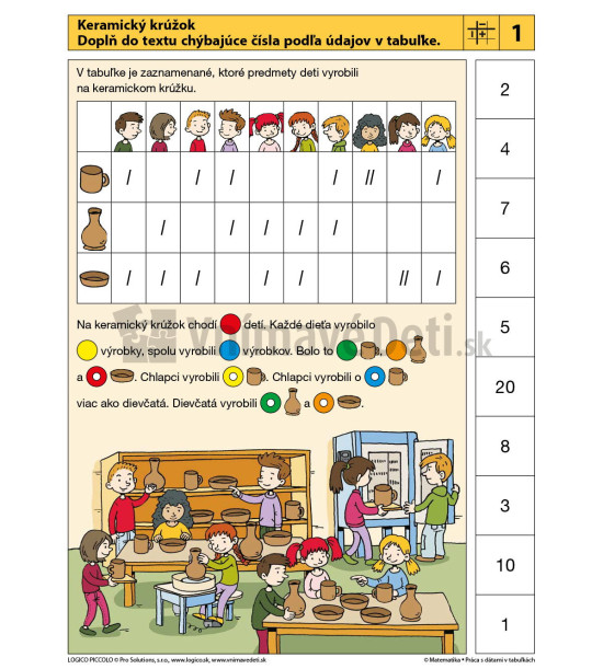 Súbor je určený pre žiakov 1. st. ZŠ, vhodný je pre 2. až 4. ročník. Cieľom súboru je naučiť žiakov orientovať sa v tabuľkách, vedieť dáta z tabuliek čítať, resp. dáta v tabuľkách vyhľadať a tiež údaje do tabuliek zapisovať. Karty sú zoradené od jednoduchších úloh k náročnejším. K zápisu dát do tabuliek sa v súbore využívajú rôzne metódy. Okrem prevažujúceho zapisovania údajov pomocou číslic je v niektorých úlohách použitá čiarkovacia metóda alebo symboly (obrázky) vyjadrujúce počet vyšší než 1.V súbore nájdete napr. tieto úlohy: - Údaje zaznamenané čiarkovacou metódou. Čítanie a interpretácia dát z tabuľky. - Jednoduché triedenie objektov a zaznamenávanie údajov do tabuľky. - Zaznamenávanie údajov z textu do tabuľky. - Súčet údajov v tabuľke, rozhodovanie o pravdivosti tvrdenia pomocou údajov v tabuľke. - Údaje zaznamenané pomocou symbolov. Čítanie dát z tabuľky. - Triedenie objektov podľa jedného znaku alebo podľa viacerých znakov.
