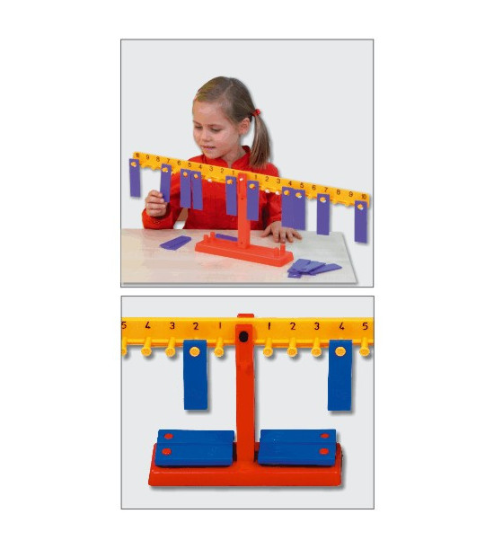 Súprava matematickej váhy a 20ks závaží (10g). Ramená váhy sú pre názornosť a ľahšiu orientáciu označené číslami 1-10. Pomôcka poslúži na hravé objasnenie a pochopenie pojmov ako sú sčítanie, odčítanie, chýbajúce číslo, základy rovnice.