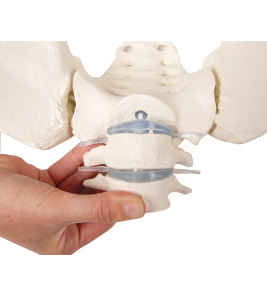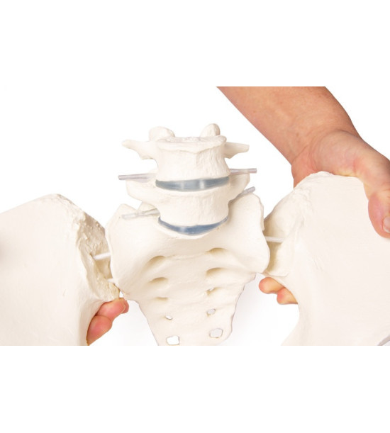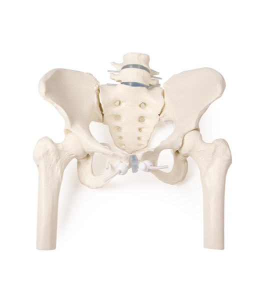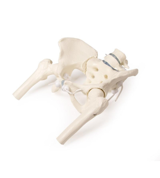 Model ženskej panvy s hlavicami stehenných kostí a 2 bedrovými stavcami - pohyblivý. Prirodzený odliatok panvy dospelej ženy Panvu je možné rýchlo a jednoducho rozobrať. Kosti sú spojené pomocou gumových pásov, ktoré umožňujú pohyblivosť. S flexibilne namontovanými bedrovými stavcami L5 a L4. Stehenné pahýle sú pohyblivé a odnímateľné.