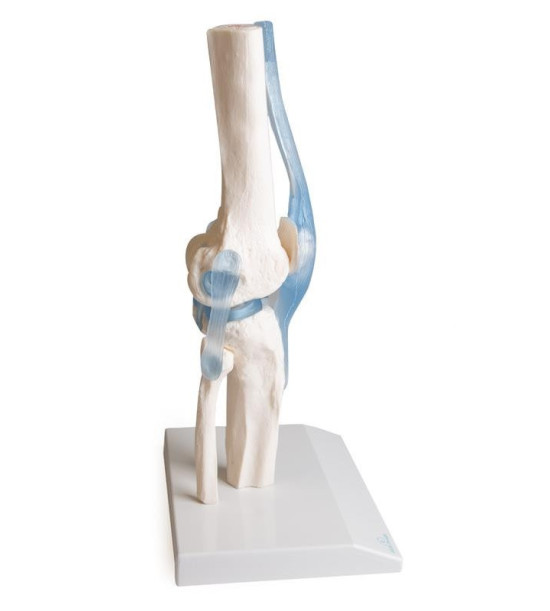 Model Kolenný kĺb s väzmi so stojanom - pohyblivý model. Prirodzený odliatok ľudského kolenného kĺbu. S pahýľmi stehennej kosti a dolnej časti nohy. Šľachy priameho svalu stehna, jabĺčka s patelárnymi šľachami, laterálne väzy, meniskus a krížové väzy sú vyrobené z elastického syntetického materiálu. Je možné demonštrovať hlavné pohyby kolenného kĺbu, ako je flexia a extenzia a vonkajšia a vnútorná rotácia. S odnímateľným stojanom.