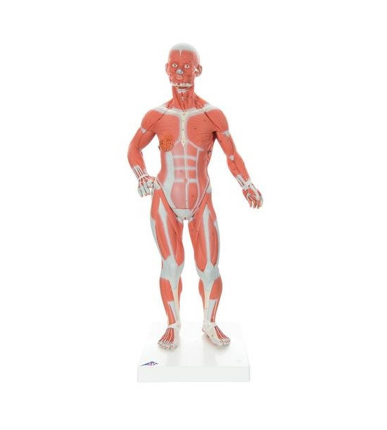 57 cm vysoký model ľudského tela znázorňujúci farebne odlíšené svalstvo od šliach. Možnosť odstránenia hrudnej časti a zobrazenie vnútorných orgánov. Na pravej strany modelu je zobrazená ženská prsná žľaza. Model je umiestnený na podstavci. Rozmery: 57x25x18 cm. Hmotnosť: 1,6 kg.