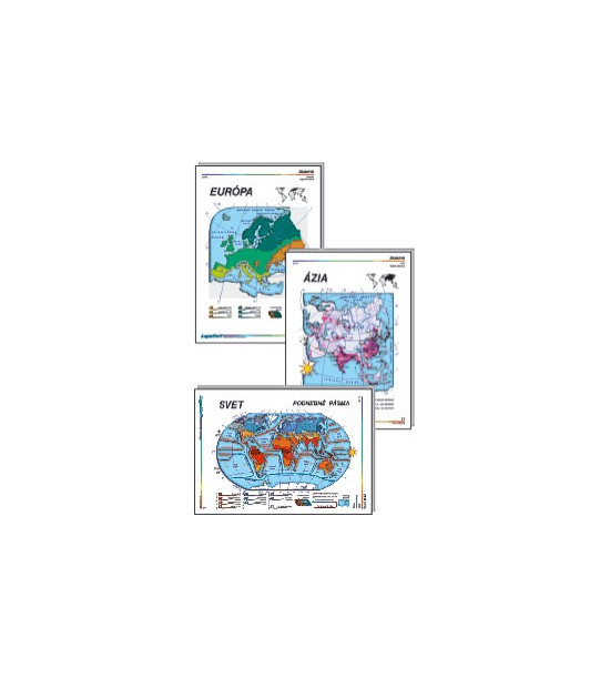 Súbor kartónových obrazov môžete využiť pri preberaní a výklade učiva o svetadieloch a oceánoch, Afrike, Európe a Ázii. Zobrazenie máp Afriky, Európy a Ázie so zameraním na: - všeobecnozemepisný popis - politické rozdelenie - podnebné pásma - vegetačné pásma - hustota zaľudnenia - geografické rozdelenie jednotlivých kontinentovObsah : 26 kartónových obrazov A3+
