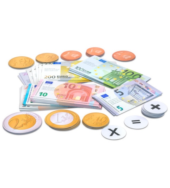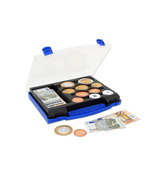 Demonštračná magnetická Euro-sada obsahuje 1 registračnú pokladnicu s triediacimi priehradkami a plastovým krytom, 40 ks bankoviek (5x 200 €, 10x 100 €, 5x 50 €, 5x 20 €, 10x 10 €, 5x 5 €) a 55 ks mincí (5x 2 €, 10x 1 €, 5x 0,50€, 5x 0,20€, 10x 0,10€t, 5x 0,05€, 5x 0,02€, 10x 0,01 €), znamienka matematických operácií ( +,-,=...). Na prednej strane je farebná potlač s reálnym vyobrazením eurobankoviek/mincí. Zadná strana je pokrytá magnetickou fóliu. Sada obsahuje nové bankovky 5€ a 10€. Vhodné pre magnetickú tabuľu. Rozmery bankoviek: dĺžka 15 - 24,4 cm, šírka 7,6 - 10,2 cm. Priemer mincí: 5 - 8 cm. Balené v kufríku s priehradkami.