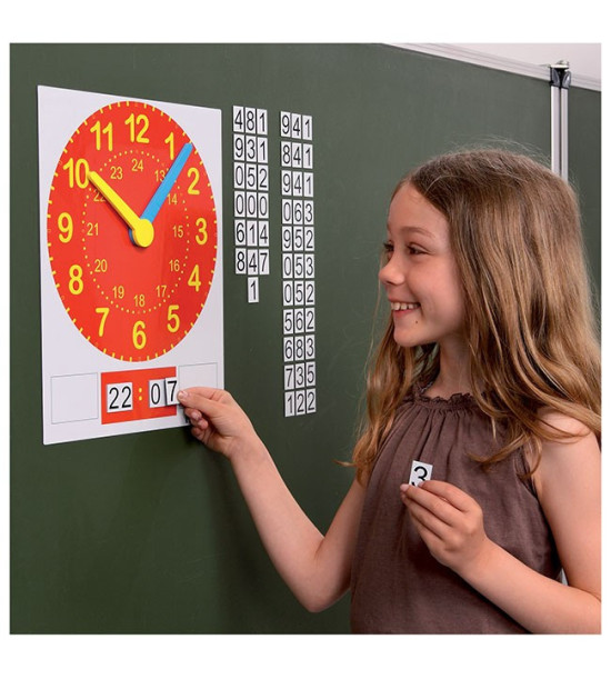 Veľké magnetické hodiny s ručičkami zobrazujú analógový čas so zreteľnými číslami 1 - 24. V spodnej časti majú priestor na digitálny čas, ktorý je tvorený dopĺňaním magnetických čísel. Hodiny sú ideálne na vysvetlenie učiva, precvičovanie času a časových úsekov, riešenie príkladov.Obsah: 2 ks veľkých ciferníkov 30 x 36cm 2 sady magnetických ručičiek 57 ks magnetických čísliel