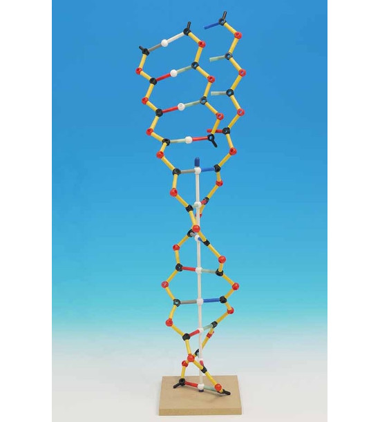 Stavebnica Orbit CW - Model DNA/RNA. Model DNA-RNA zobrazuje 12 párov báz s každou bázou (guanín, cytozín, tymín, adenín a uracil) inej farby a cykly cukrov, fosfátové skupiny a vodíkové väzby čiernou, červenou a bielou. Model obsahuje páry báz na zobrazenie jednej otáčky dvojitej špirály. Reťazce DNA môžu byť spojené/oddelené, aby sa demonštrovala transkripcia RNA. Je vhodný pre stredné školy a pokročilé úrovne vzdelávania. Obsah súpravy: 30 báz (7x guanín, 7x cytozínv, 7x tymín, 7x adenín, 2x uracil), 12 vodíkových väzieb, 28 cyklov cukru, 25 jednotiek kyseliny fosforečnej, 50 nukleotidových spojovacích článkov, podporný stojan, pokyny transkripcie RNA. Výška v zloženom stave: 50 cm.