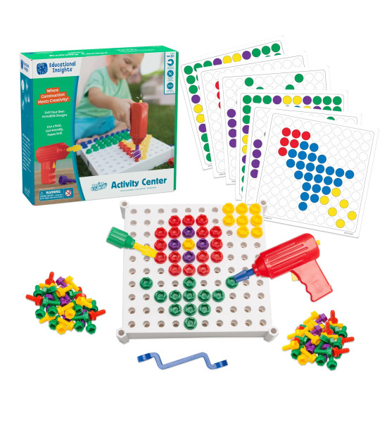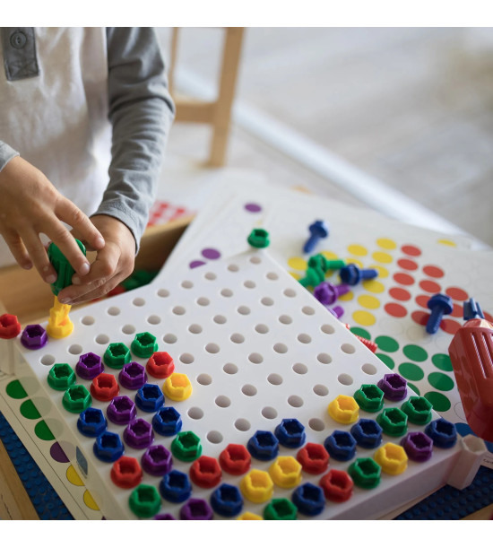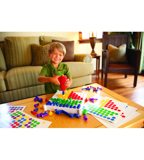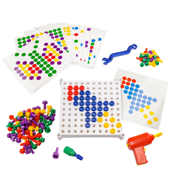 Deti skrutkujú farebné vzory do skrutkovacej podložky. Realistické nástroje rozvíjajú ranné zručnosti vrátane rozpoznávania farieb, počítania, rozvoja motorických zručností ruky. Sada obsahuje: skrutkovač na baterky so spätným chodom, francúzsky kľúč, 10 obojstranných vzorových kariet s 20 farebnými aktivitami, 100 plastových skrutiek v 5 farbách. Skrutkovač je napájaný 3x "AA" batériami, ktoré nie sú súčasťou sady. Vek 3+