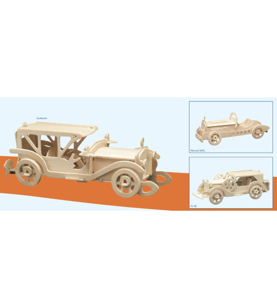 Poskladaj si 3 modely veteránov : Sunbeam, Oldtimer Mercedes SSKL a Ford V8. Drevená stavebnica v rozloženom stave. Jednotlivé diely sú v rámčeku na preglejkových doskách a stačí ich len vylomiť a poskladať. Maľovanie je už na fantázii detí.Rozmery a počty dielov jednotlivých modelov: Sunbeam 11 x 28 x 11 cm, 43 dielov; Oldtimer 9 x 26 x 9 cm, 39 dielov a Ford 9 x 27 x 9 cm, 46 dielov v prírodnej farbe dreva.
