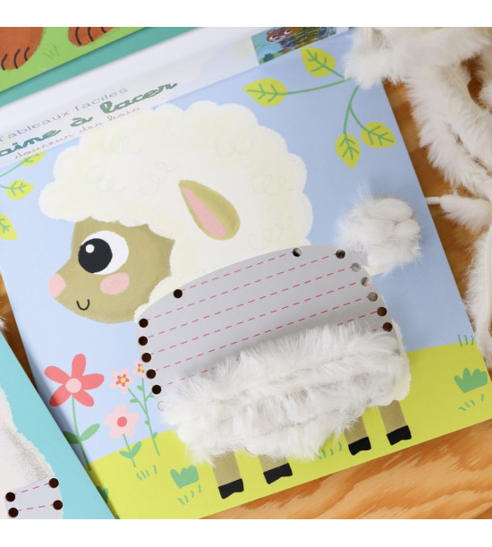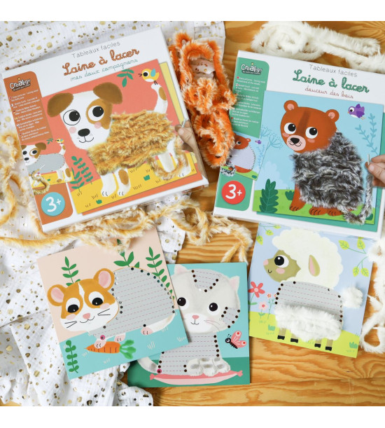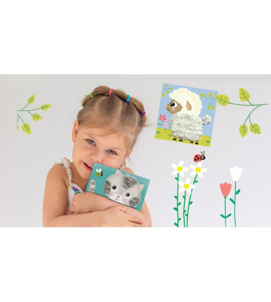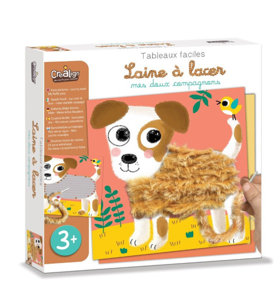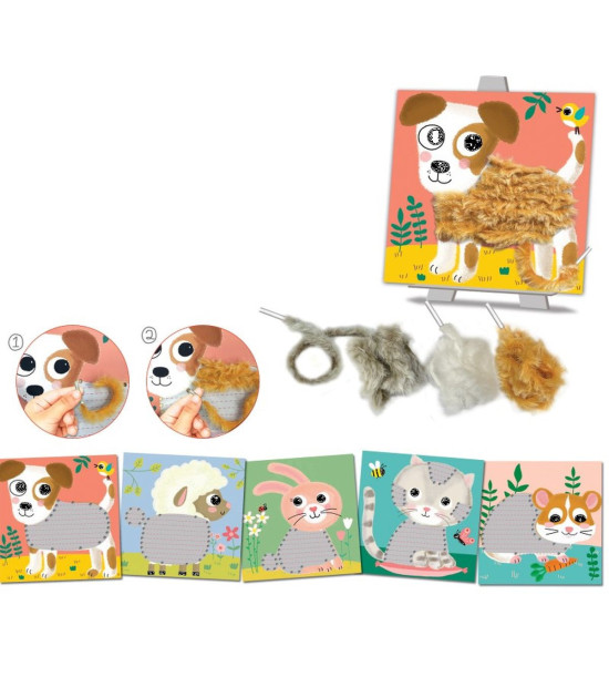 Kreatívna sada pre deti Prevliekacie obrázky Huňaté zvieratká od francúzskej značky Crea Lign z radu Jednoduché obrázky je vhodná už pre deti od 3 rokov. Obsahuje 5 podkladových obrázkov zvieratiek s dierkami na prevliekanie, ktoré si deti jednoducho dotvoria 80 cm dlhými, chlpatými povrázkami (čierna, hnedá, biela a hnedosivá). Balenie tiež obsahuje návod, hárok nálepiek na zafixovanie povrázkov a skladací papierový stojan na vystavenie hotového umeleckého diela. Rozmery: 24.5cm X 24.5cm X 4cm