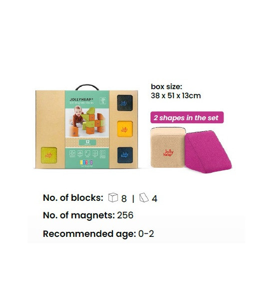 Magnetické stavebnice JollyHeap prinášajú deťom jedinečný zážitok z hry, ktorý podporuje rozvoj motorických schopností, logického myslenia a kreativity. Vďaka magnetom umiestneným na všetkých stranách kociek môžu deti jednoducho spájať rôzne tvary a vytvárať rozmanité konštrukcie. Stavebnice sú vyrobené z mäkkého, no odolného materiálu, ktorý je bezpečný aj pre najmenšie deti. Navyše si môžete vybrať z 36 farebných kombinácií, vďaka čomu je možné stavebnicu zladiť s interiérom detskej izby. Objavte širokú ponuku stavebníc JollyHeap, ktoré sú ideálne na domáce hranie aj pre materské školy a herné centrá. Obsah: 12 mäkkých magnetických blokov (8x štvorec, 4x trojuholník) s rozmermi 12x12 cm a hmotnosťou 150 g. Každá kocka je vyplnená elastickou penou s vysokou hustotou, ktorá zabezpečuje, že kocka si po stlačení vždy zachová svoj tvar. Povrch je potiahnutý príjemnou, no odolnou látkou s pevnými švami, ktoré zabraňujú prístupu k magnetom. Vďaka certifikátom EN 71-1, EN 71-2 a EN 71-3 je stavebnica bezpečná pre deti všetkých vekových kategórií. Pre jednoduchú údržbu je možné kocky prať v práčke pri teplote 30 °C.
