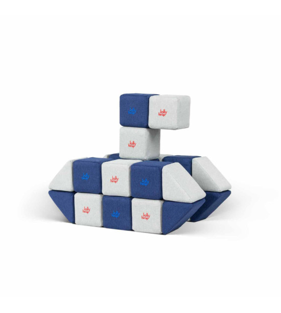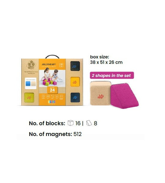 Magnetické stavebnice JollyHeap prinášajú deťom jedinečný zážitok z hry, ktorý podporuje rozvoj motorických schopností, logického myslenia a kreativity. Vďaka magnetom umiestneným na všetkých stranách kociek môžu deti jednoducho spájať rôzne tvary a vytvárať rozmanité konštrukcie. Stavebnice sú vyrobené z mäkkého, no odolného materiálu, ktorý je bezpečný aj pre najmenšie deti. Navyše si môžete vybrať z 36 farebných kombinácií, vďaka čomu je možné stavebnicu zladiť s interiérom detskej izby. Objavte širokú ponuku stavebníc JollyHeap, ktoré sú ideálne na domáce hranie aj pre materské školy a herné centrá. Obsah: 24 mäkkých magnetických blokov (16x štvorec, 8x trojuholník) s rozmermi 12x12 cm a hmotnosťou 150 g. Každá kocka je vyplnená elastickou penou s vysokou hustotou, ktorá zabezpečuje, že kocka si po stlačení vždy zachová svoj tvar. Povrch je potiahnutý príjemnou, no odolnou látkou s pevnými švami, ktoré zabraňujú prístupu k magnetom. Vďaka certifikátom EN 71-1, EN 71-2 a EN 71-3 je stavebnica bezpečná pre deti všetkých vekových kategórií. Pre jednoduchú údržbu je možné kocky prať v práčke pri teplote 30 °C.