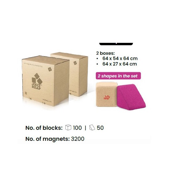 Magnetické stavebnice JollyHeap prinášajú deťom jedinečný zážitok z hry, ktorý podporuje rozvoj motorických schopností, logického myslenia a kreativity. Vďaka magnetom umiestneným na všetkých stranách kociek môžu deti jednoducho spájať rôzne tvary a vytvárať rozmanité konštrukcie. Stavebnice sú vyrobené z mäkkého, no odolného materiálu, ktorý je bezpečný aj pre najmenšie deti. Navyše si môžete vybrať z 36 farebných kombinácií, vďaka čomu je možné stavebnicu zladiť s interiérom detskej izby. Objavte širokú ponuku stavebníc JollyHeap, ktoré sú ideálne na domáce hranie aj pre materské školy a herné centrá. Obsah: 150 mäkkých magnetických blokov (100x štvorec, 50x trojuholník) s rozmermi 12x12 cm a hmotnosťou 150 g. Každá kocka je vyplnená elastickou penou s vysokou hustotou, ktorá zabezpečuje, že kocka si po stlačení vždy zachová svoj tvar. Povrch je potiahnutý príjemnou, no odolnou látkou s pevnými švami, ktoré zabraňujú prístupu k magnetom. Vďaka certifikátom EN 71-1, EN 71-2 a EN 71-3 je stavebnica bezpečná pre deti všetkých vekových kategórií. Pre jednoduchú údržbu je možné kocky prať v práčke pri teplote 30 °C.