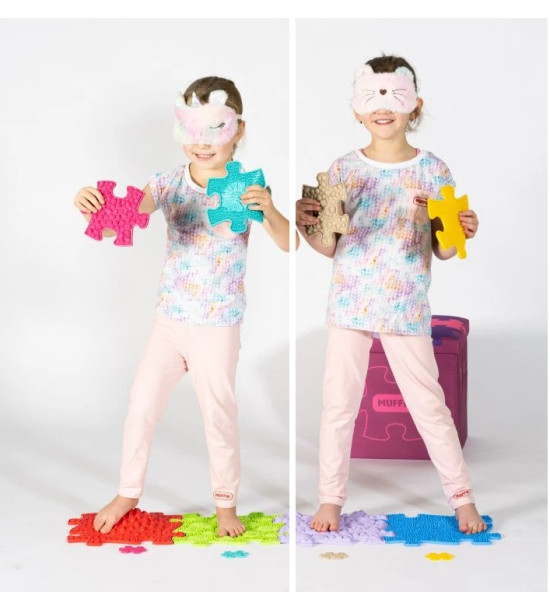 Toto pexeso nie je zamerané na vizuálne hľadanie, dvojice sa totiž hľadajú hmatom. Bez použitia zraku sa účastníci pokúsia spojiť mini podložku, ktorú držia v ruke s veľkou podložkou rovnakej textúry, po ktorej chodia. Prenos pocitov z chodidiel na ruky zvyšuje koncentráciu, pozornosť a ovplyvňuje rozvoj jemnej motoriky, inteligencie a pamäte dieťaťa a prepája pravú a ľavú hemisféru mozgu.Obsah 12 ks: 1 x tráva mäkká (fialová), 1x pobrežie tvrdé (modrá), 1 x lúka mäkká (pastelovožltá), 1 x orechy tvrdé (hnedá), 1x MINI tráca mäkká (žltá), 1x MINI Slimák tvrdý (ružová), 1x MINI Lúka mäkká (tyrkysová), 1x MINI Orechy tvrdé (pastelovozelená), 1x kľúčenka tráva (žltá), 1x kľúčenka Slimák (ružová), 1x kľúčenka Lúka (tyrkysová), 1x kľúčenka Orechy (pastelovozelená). Rozmer jednej podložky je 29,79 x 29,79 cm; rozmer jednej mini podložky: 14,25 x 17,29 cm; rozmer kľúčenky: 6,5 x 5,4 cm.