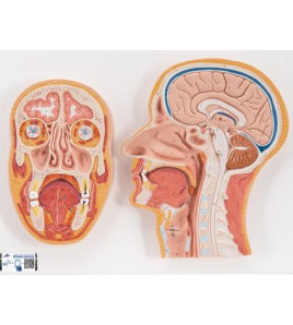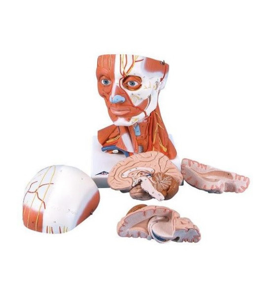 Zobrazenie povrchného a hĺbkového svalstva, nervov a ciev. Rozkladateľný model svalstva hlavy a krku sobsahuje aj trojdielny mozog. Tento vysoko kvalitný model je dodávaný na základnej doske.