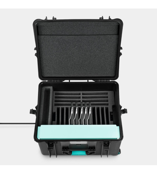 Mobilná nabíjacia stanica - nabíjací vozík TransformerCase T20MLX pre 20 tabletov veľkosti 11". Obsahuje nabíjacie zásuvkami (2-kolíkový Euro konektor 10A/230V), simultánne nabíjanie, integrovaný podvozok (zabudované kolieska), vysúvaciu rukoväť a bočné držadlá (umožňujú prenášať nabíjací vozík po schodoch), integrovaný ventilačný systém (emisia hluku do 31 dBA), uzamykateľný zámok. Kapacita pre max. 20 tabletov veľkosti do 11". Len nabíjanie (nabíjací 2m kábel adaptéra 230V) ! Rozmery (DxŠxV) 620 x 520 x 350 mm; hmotnosť 15,2 kg.