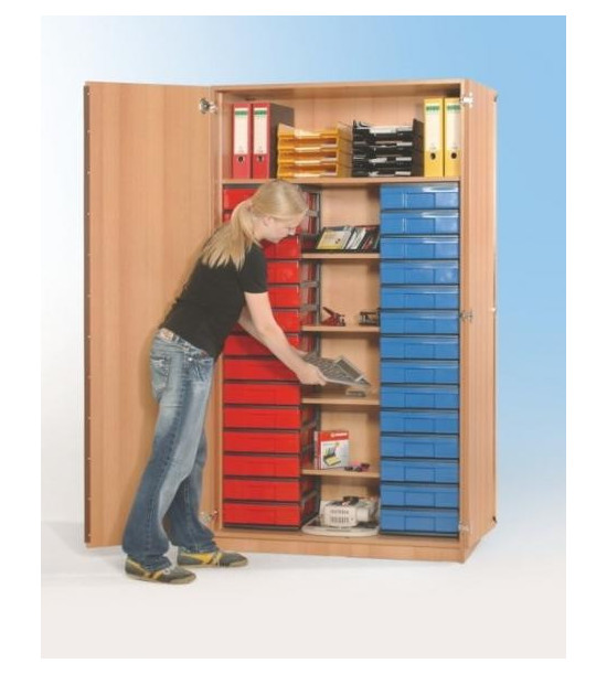 Praktická uzamykateľná skriňa do triedy alebo kabinetu na prehľadné odkladanie učebných pomôcok, hračiek, športových potrieb, úborov, dokumentov. Skriňa obsahuje farebný kontajnerový systém. Korpusy skríň sú vyrobené z laminovanej drevotrieskovej dosky 18 mm hrúbky s 2 mm ABS hranou. Pánty na otvorenie dverí na 270 stupňov. Rozmer 190 x 103 x 50 cm, 28 výsuvných boxov. Cena dopravy a inštalácie sa kalkuluje samostatne.