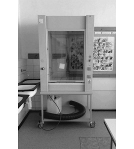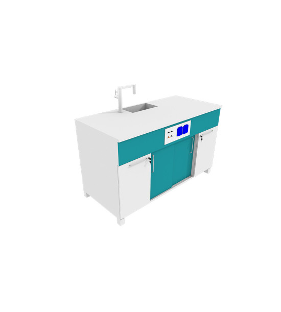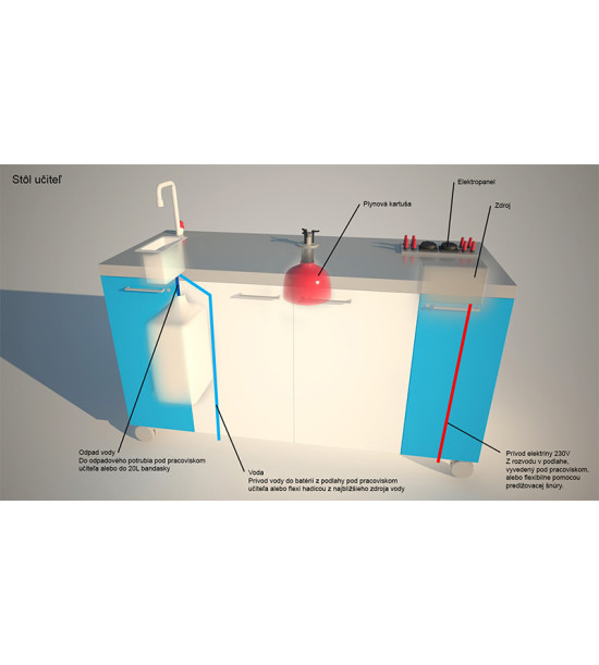 Laboratórne pracovisko učiteľa s pripojením na sieťové napätie 230V/50Hz. Požadovaný rozmer pracoviska 1500x600x800mm, konštrukcia aj pracovná plocha z chemicky odolného materiálu. Pracovisko je vyrobené s pevnou kovovou konštrukciou s párom pevných bantamových kolies a s párom otočných bantamových kolies opatrených brzdou. Nosná konštrukcia je vyrobená z kovového profilu hrúbky 3mm. Krycie plochy, police a dvierka sú vyrobené z laminovanej drevotriesky hrúbky 18 mm. Dvierka sa otvárajú do pravého uhla. Pracovná doska je z obojstranného postformingu hrúbky 36mm. Oceľová konštrukcia je s povrchovou úpravou elektrostaticky naneseným epoxidovým vypaľovacím lakom. Pracovisko spĺňa certifikát hygienickej nezávadnosti, certifikát o mechanicko-fyzikálnych skúškach a je v zhode s platnými STN (EN). Na pracovnej ploche je osadená chemicky odolná výlevka s rozmerom 150x150mm (alternatívne s priemerom 150 mm), sifónom z chemicky odolného materiálu s možnosťou napojenia na existujúce odpadové potrubie v učebni (alternatívne s možnosťou napojenia do 10l odpadovej chemicky odolnej bandasky). Na pracovnej ploche je vyvedený ventil na pripojenie plynu. Na pracovnej doske je osadená batéria na vodu z chemicky odolného materiálu, vývod zakončený olivkou. Prívod vody do batérie je riešený s možnosťou pripojenia na existujúcu prípojku vody v učebni. Pripojenie pracoviska na napätie 230V je s možnosťou pripojenia na existujúci samostatný prívod elektriny v učebni, istený prúdovým chráničom max. na 16A. Elektropanel učiteľa je zabudovaný a má rozmer 150x300mm, je kovový s nezmazateľnými popismi prvkov. Prvky elektropanelu sú: 2x zásuvka s uzemnením na 230V s krytkou a bezpečné napätie max. 30V. Elektropanel zodpovedá platným bezpečnostným požiadavkám smerníc Rady EU pre školské prostredie. Členený úložný priestor je uzamykateľný a určený pre uskladnenie učebných pomôcok, prístrojov alebo skladacej učiteľskej stoličky. Pracovisko má bezpečnostný certifikát. Súčasťou dodávky pracoviska je projekt pre jeho zapojenie, testovancí protokol a návod na obsluhu v slovenskom jazyku. Farebné prevedenie pracoviska podľa vzorkovníka.