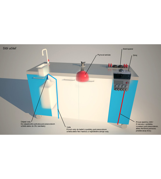 Laboratórne pracovisko učiteľa s pripojením na sieťové napätie 230V/50Hz a bezpečné napätie max. 30V. Rozmer pracoviska 1500x600x800mm, konštrukcia aj pracovná plocha z odolného materiálu. Pracovisko je vyrobené s pevnou kovovou konštrukciou a s párom pevných bantamových kolies a s párom otočných bantamových kolies opatrených brzdou. Nosná konštrukcia je vyrobená z kovového profilu hrúbky 3mm. Krycie plochy, police a dvierka sú vyrobené z laminovanej drevotriesky hrúbky 18 mm. Dvierka sa otvárajú do pravého uhla. Pracovná doska je z obojstranného postformingu hrúbky 36mm. Oceľová konštrukcia je s oblými hranami a s povrchovou úpravou elektrostaticky naneseným epoxidovým vypaľovacím lakom. Pracovisko spĺňa certifikát hygienickej nezávadnosti, certifikát o mechanicko-fyzikálnych skúškach a je v zhode s platnými STN (EN). Elektropanel učiteľa je zabudovaný a má rozmer 150x300mm je kovový s nezmazateľnými popismi prvkov. Prvky elektropanelu sú: 2 ks zásuvka s uzemnením na 230V s krytkou, zásuvky na bezpečné jednosmerné 1x a na striedavé výstupné napätie 1x. Parametre zásuvky na bezpečné napätie - AC banánik 4mm; 10A; čierny; parametre zásuvky na bezpečené napätie DC - banánik 4mm; 10A; čierny ( -) červený ( +). Elektropanel zodpovedá platným bezpečnostným požiadavkám smerníc Rady EU pre školské prostredie. Na pracovnej ploche je osadená chemicky odolná výlevka s rozmerom 150x150mm (alternatívne s priemerom 150 mm), sifónom z chemicky odolného materiálu s možnosťou napojenia na existujúce odpadové potrubie v učebni (alternatívne s možnosťou napojenia do 10l odpadovej chemicky odolnej bandasky). Na pracovnej ploche je vyvedený ventil na pripojenie plynu. Na pracovnej doske je osadená batéria na vodu z chemicky odolného materiálu, vývod zakončený olivkou, prívod z pripraveného rozvodu vody v učebni. Pripojenie pracoviska na napätie 230V je s možnosťou pripojenia na existujúci samostatný prívod elektriny v učebni, istený prúdovým chráničom na 16A. Pripojenie pracoviska na bezpečné jednosmerné a striedavé napätie do 30V je pomocou laboratórneho zdroja bezpečného napätia, ktorý je súčasťou pracoviska. Parametre zdroja sú: zdroj stabilizovaného napätia a prúdu s tromi integrovanými okruhmi: DC jednosmerný zdroj 0-30V plynule nastaviteľný s nastaviteľným obmedzením prúdu 0-3A, AC striedavý zdroj diskrétny 3,6,9,12,15,18 V výstupný prúd 3A, DC jednosmerný zdroj pevný 12V s obmedzením 1A, Napájanie 230 V AC, ochrana proti preťaženiu a reset pre AC zdroj 4x LCD : napätie DC, prúd DC, napätie AC, prúd AC, CE certifikát pre bezpečné používanie. Členený úložný priestor je uzamykateľný a určený pre uskladnenie učebných pomôcok, prístrojov alebo skladacej učiteľskej stoličky. Pracovisko má bezpečnostný certifikát. Súčasťou dodávky pracoviska je projekt pre jeho zapojenie, testovancí protokol a návod na obsluhu v slovenskom jazyku. Farebné prevedenie pracoviska podľa vzorkovníka.