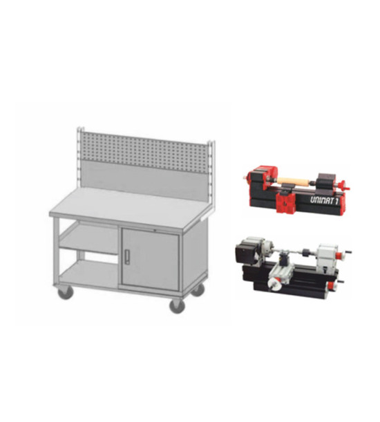 Dielenské pracovisko učiteľa na obrábanie kovov a dreva pripojiteľné na napätie 230 V. Súčasťou pracoviska je stavebnicové zariadenie na obrábanie dreva a kovov (sústruh, brúska), úložný priestor na odkladanie nástrojov a závesný panel. Rozmer pracoviska 150x60x150 cm (š x h x výška vrátane závesného panelu). Pracovisko vyrobené na pevnom vystuženom podvozku s párom pevných kolies a párom otočných kolies opatrených brzdou. Nosná konštrukcia je vyrobená z 3 mm plechu, skrinka a police sú vyrobené z 1 mm hrubého plechu. Dvierka sa otvárajú do pravého uhla a sú osadené v čapoch. Stolová doska je vyrobená z bukových hranolov priebežne lepených do tvaru dosky, následne obrúsených a ošetrených roztokmi olejov a prísadami. Pracovná doska má zrazené hrany. Závesný panel je vyrobený z perforovaného plechu. Pripojenie pracoviska na napätie 230 V je zabezpečené flexibilných pripojením v dĺžke +/- 5m. Na prístupnej strane pracoviska je vyvedená 3x zásuvka na 230 V. Pracovisko má bezpečnostný certifikát. Stavebnicové zariadenie na obrábanie dreva a kovov má funkciu brúsky a sústruhu s nasledujúcim technickými parametrami: bezpečné napájacie napätie, pozdĺžny posuv a obsahuje toto príslušenstvo: trojčeľusťové skľučovadlo, držiak nástroja, otočný strediaci hrot, sústružnícky nôž a video-manuál. Súčasťou dodávky pracoviska je projekt pre jeho zapojenie, otestovanie, zaškolenie a Protokol o uvedení do prevádzky.