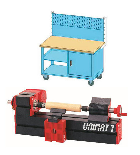 Dielenské mobilné pracovisko na obrábanie dreva - pre dvojicu žiakov. Pracovisko je pripojiteľné na napätie 230V, obsahuje stavebnicový sústruh na obrábanie dreva (parametre sústruhu: vzdialenosť medzi stredmi v rozsahu 50-120 mm, Motor: otáčky min. 11000 ot/min, 3A, zdroj 12 V, držiak nástroja, dlátko, trojčeľusťové skľučovadlo, otočný strediaci hrot, sane, podpora pre nástroj, upevňovanie pomocou T drážky, video-manuál v slovenčine ), úložný priestor na odkladanie nástrojov a závesný panel na odkladanie nástrojov. Rozmer pracoviska je 120x60x150cm (š x h x výška vrátane závesného panelu, modifikácia tohto rozmeru je možná len na jeden z rozmerov a to max. do 5% z uvedenej hodnoty). Pracovisko je vyrobené na pevnom vystuženom podvozku (aj s párom pevných kolies a párom otočných kolies opatrených brzdou). Nosná konštrukcia je vyrobená z 3 mm plechu, skrinka a police sú vyrobené z 1mm hrubého plechu. Dvierka sa otvárajú do pravého uhla a sú osadené v čapoch. Stolová doska je vyrobená z bukových hranolov priebežne lepených do tvaru dosky, následne obrúsených a ošetrených roztokmi olejov a prísadami. Pracovná doska má zrazené hrany. Závesný panel je z perforovaného plechu. Pripojenie pracoviska na napätie 230 V je zabezpečené flexibilným pripojením do rozsahu +/- 5 m. Na prístupnej strane pracoviska je vyvedená 3x zásuvka na 230 V. Pracovisko má bezpečnostný certifikát. Súčasťou dodávky pracoviska je projekt pre jeho zapojenie, otestovanie, zaškolenie a Protokol o uvedení do prevádzky.