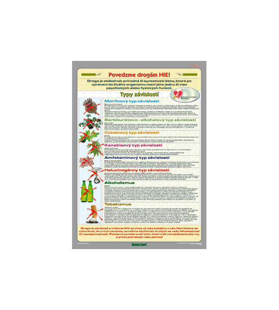 Nástenná tabuľa informuje o základných typoch závislostí spolu s prejavmi pri predávkovaní a abstinenčných príznakoch. Žiaci sa dozvedia čo to droga vlastne je a že problém drogovej závislosti sa týka každého z nás. Čím viac o tejto veľmi horúcej dlho tabuizovanej téme v súčasnosti vieme, tým je pre nás riziko podľahnutia menšie. Produkt je vybavený plátennými šnúrkami, ktoré slúžia na zavesenie a zrolovanie. Povrch produktu je umývateľný a z vrchnej a spodnej strany je vybavený lištami. Rozmer 100x140cm
