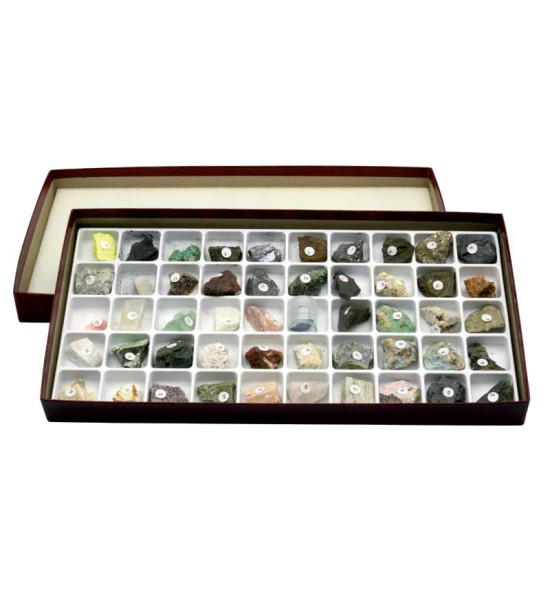 Minerály rôzneho geologického a geografického pôvodu. Set v kazete z pevnej lepenky obsahuje 40 alebo 50 kusov minerálov (výrobca dodáva rôzne množstvá).