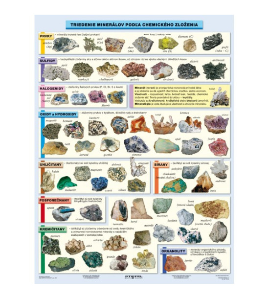 Obojstranná didaktická pomôcka Triedenie minerálov podľa chemického zloženia je určená na hodiny biológie pre 2. stupeň ZŠ a gymnáziá. Prehľadná tabuľa umožňuje spoznávať a rozlišovať jednotlivé skupiny minerálov prostredníctvom vymenovaných charakteristických znakov a konkrétnych fotografií minerálov. - formát 120x160 cm - prevedenie DUO - MAX tabuľky 20 A4