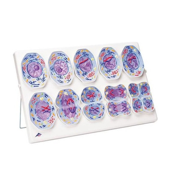 Model meiózy prezentuje 10 základných fází redukčného delenia bunky. Anatomické štruktúry všetkých fáz sú vyznačené farebne presne tak, ako by ste ich videli v mikroskope. Zo zadnej strany vybavené magnetmi, čo umožňuje jednotlivé fázy demonštrovať a magnetickej tabuli. · - Úložný systém, samostatne stojaci alebo zavesený - 10 000-krát zväčšené Trojrozmerný reliéfny model ukazuje 10 stupňov meiózy na základe typickej bunky cicavca: Medzifáza (fáza G1), Profáza I (subfázy leptoténne, zygoténne, pachyténne, diploténne a diakinéza), Metafáza I, Anafáza I, Telofáza I (cytokinéza I, interkinéza, profáza II a metafáza II), Anafáza II, Telopáza II a cytokinéza II. Rozmery 60x40x6 cm.