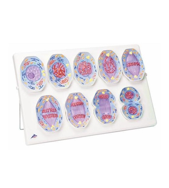 Model ukazuje 9 štádií mitózy na príklade typickej bunky cicavca v cca 10 000 násobnom zväčšení. Pomôcka pre pochopenie bunkového delenia. 9 fáz mitózy na základe typickej bunky cicavca: Interfáza, Profáza, skoršia prometafáza, pokročilá prometafáza, Metafáza, skoršia anafáza, pokročilá anafáza, Telofáza, Cytokinéza. Rozmery 60x40x6 cm.
