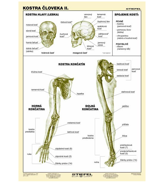 Náučné tabule KOSTRA ČLOVEKA I., II. sú určené pre výučbu témy opornej sústavy. I. diel je zameraný na funkcie kostry, hlavné časti kostry človeka a na stavbu kostí. II. diel obsahuje popis hlavných kostí: kostry lebky, kostry horných končatín, kostry dolných končatín a prehľadnú tabuľku spojenia kostí. Zadné strany náučných tabulí sú bez textu a slúžia k precvičovaniu aj ku skúšaniu. Oba diely sú určené pre 8.- 9. ročník ZŠ a gymnázií.