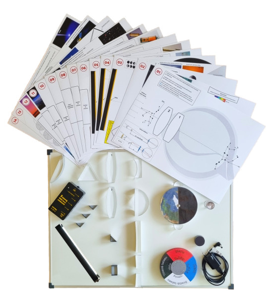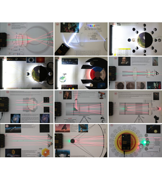 ASTRO LASER SET obsahuje všetky komponenty potrebné na vysvetlenie tém a úloh popísaných v manuáli. LED zdroj svetla predstavuje Slnko, 5 lúčový laserový zdroj svetla sa využíva pri vysvetľovaní princípov optických prístrojov. Vesmírne telesá (Zem, Mesiac, exoplanéta), optické prvky (šošovky, zrkadlá a pod.) a zdroje svetla sa umiestňujú na pracovné výkresy, ktoré sú súčasťou súpravy. Optické moduly sa zároveň dajú použiť aj na úlohy v manuáli nepopísané, ako napríklad odraz a lom svetla, totálny odraz a pod.