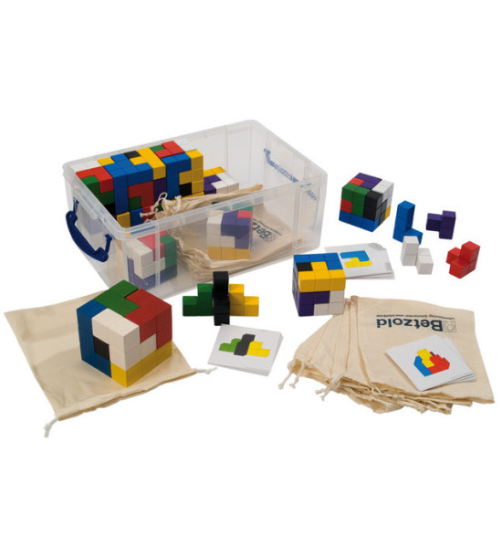 Farebné stavebné kocky na precvičenie priestorového vnímania pre celú triedu. Časti sa navzájom jednoducho spájajú. Obsah: 12 malých Soma-kociek (z 2cm dielikov, hrana kocky 6cm), 1 demonštračná Soma-kocka (z 3cm dielikov, hrana kocky 9cm), 60 kartičiek s úlohami a výsledkami, plastová debnička (objem 9l) na uskladnenie.